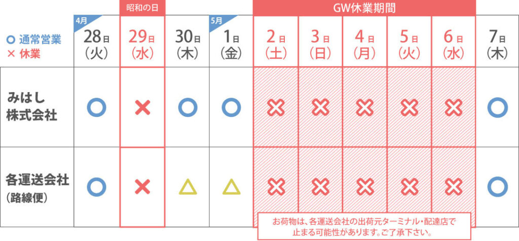 配送停止期間: 2025年4月29日、5月2日~5月6日